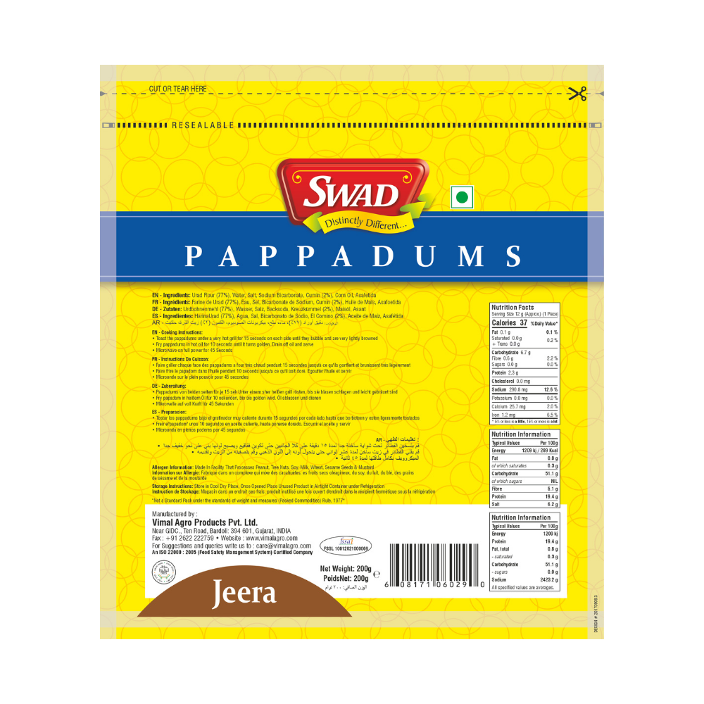 Enjoy the timeless taste of cumin with SWAD Jeera Pappadums. Made from premium quality lentils and seasoned with aromatic jeera (cumin), these pappadums offer a light, thin, and perfectly crispy texture with a warm, earthy flavour. Quick and easy to roast or fry, SWAD Jeera Pappadums are a perfect accompaniment to Indian meals, chutneys, and curries, or can be enjoyed as a crunchy snack or starter. A classic favourite that complements every meal beautifully.