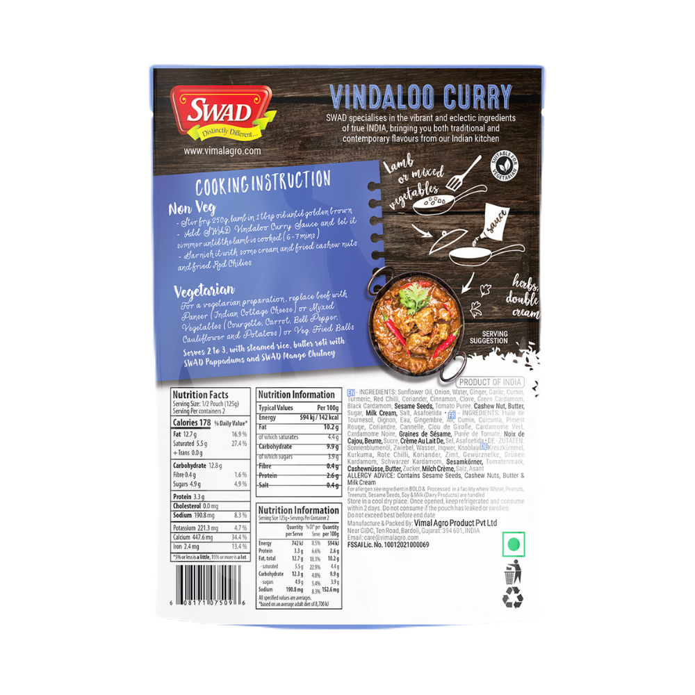 SWAD Vindaloo Curry is perfect for preparing authentic vindaloo dishes at home. Ideal for pork, chicken, meat, or vegetables, this ready-to-use curry base helps you create restaurant-style meals effortlessly, pairing perfectly with steamed rice or Indian breads.