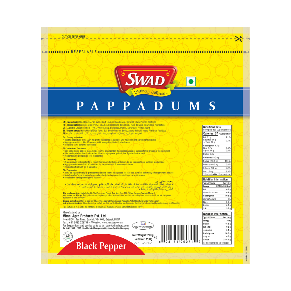 Add a crunchy and flavourful touch to your meals with SWAD Black Pepper Pappadums. Made from high-quality lentils and seasoned with bold black pepper, these pappadums deliver a perfectly crisp texture with a warm, peppery kick in every bite. Light, thin, and easy to prepare, SWAD Black Pepper Pappadums can be roasted or fried in seconds. They make an ideal accompaniment to Indian meals, chutneys, curries, or as a crunchy snack on their own.